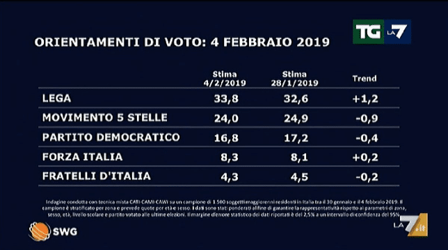 Quanto alle intenzioni di voto, come detto, il vantaggio della Lega sul Movimento Cinque Stelle è ormai di 10 punti: il partito di  Salvini veleggia al 33,8 per cento, con il movimento guidato da Luigi Di Maio che insegue molto staccato al 24 per cento.