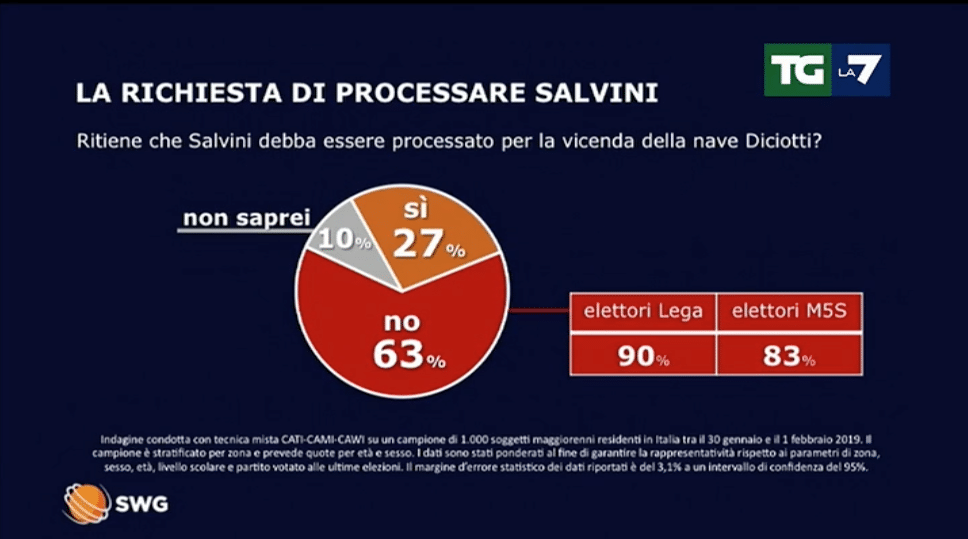 Il 63 per cento degli intervistati ritiene che Salvini non dovrebbe essere processato per il caso Diciotti: la pensa così il 90 per cento degli elettori della Lega, ma anche l’83 per cento dei sostenitori M5S, dato quest’ultimo molto interessante in vista del voto al Senato sull’autorizzazione a procedere contro il vicepremier.