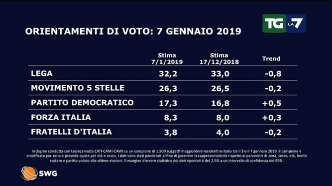Ultimi Sondaggi Politici oggi – Come già emerso nel sondaggio di cui vi abbiamo dato notizia ieri, in questo inizio di 2019 sembra si stia lentamente riducendo il vantaggio della Lega sul Movimento Cinque Stelle [qui tutti gli ultimi sondaggi].