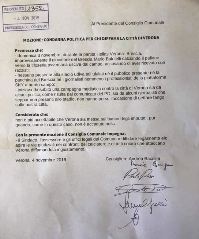Il consigliere della maggioranza di centrodestra, Andrea Bacciga, ha presentato una singolare mozione per chiedere di impegnare il sindaco, gli assessori e gli uffici legali a “diffidare legalmente e/o adire le vie giudiziali nei confronti del calciatore e di tutti coloro che attaccano Verona diffamandola ingiustamente”.