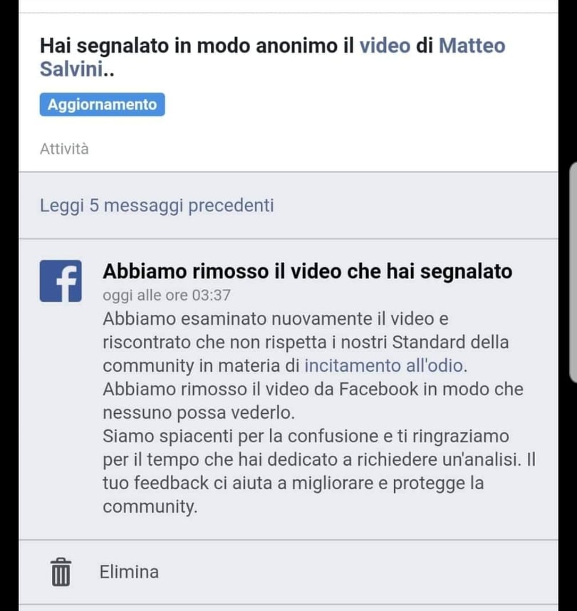 Coloro che hanno segnalato il video, infatti, hanno ora ricevuto un messaggio da Facebook con le seguenti parole: “Abbiamo rimosso il video che hai segnalato”.