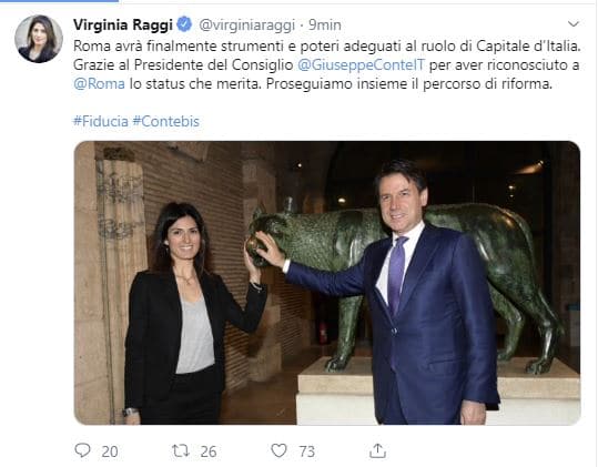 ore 13,40 – Virginia Raggi esulta. “Roma avrà finalmente strumenti e poteri adeguati al ruolo di Capitale d’Italia. Grazie al Presidente del Consiglio Giuseppe Conte per aver riconosciuto a Roma lo status che merita. Proseguiamo insieme il percorso di riforma”. Lo scrive su Twitter la sindaca Virginia Raggi.