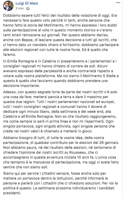 “Dobbiamo essere tutti felici del risultato della votazione di oggi” ha scritto Di Maio, secondo il quale gli iscritti “ci hanno dato un mandato chiaro e fortissimo: dobbiamo partecipare alle elezioni regionali con tutte le nostre forze. Ed è quello che faremo”.