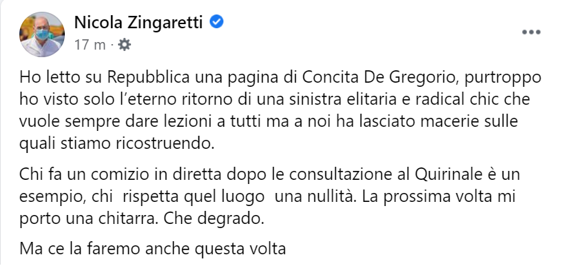 “Chi fa un comizio in diretta dopo le consultazione al Quirinale è un esempio, chi rispetta quel luogo una nullità. La prossima volta mi porto una chitarra”, prosegue il post del leader dem. “Che degrado. Ma ce la faremo anche questa volta”, conclude Zingaretti.