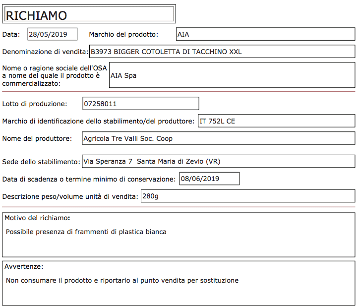Per sapere se si è comprato una confezione a rischio bisogna controllare il lotto indicato sopra: quello che potrebbe contenere frammenti di plastica bianca è il numero 07258011. Si tratta delle Cotolette di Tacchino Bigger XXL di Aia, prodotte dall’azienda agricola Tre Valli di Santa Maria di Zevio, in provincia di Verona. Il codice di identificazione dello stabilimento è IT 752L CE.