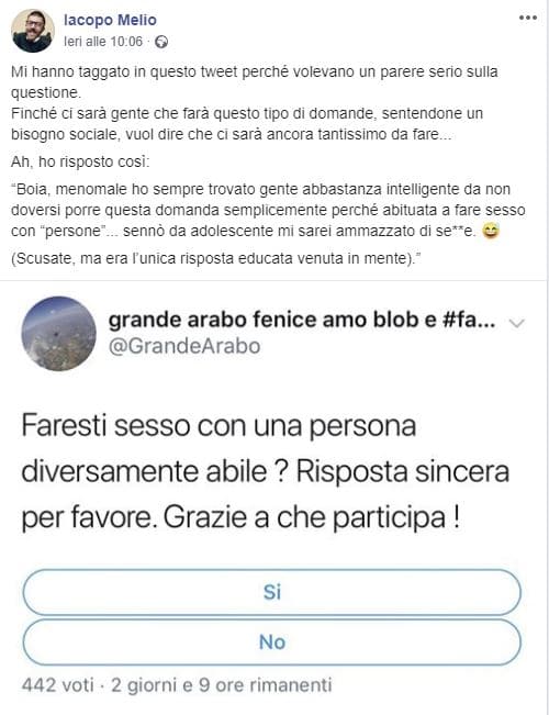 Iacopo Melio scrive due post in cui affronta la questione. Nel primo parla del sondaggio e scrive quella che è stata la sua risposta sotto a quella domanda: “Finché ci sarà gente che farà questo tipo di domande, sentendone un bisogno sociale, vuol dire che ci sarà ancora tantissimo da fare… Ah, ho risposto così: ‘Boia, menomale ho sempre trovato gente abbastanza intelligente da non doversi porre questa domanda semplicemente perché abituata a fare sesso con “persone”… sennò da adolescente mi sarei ammazzato di se**e'”.