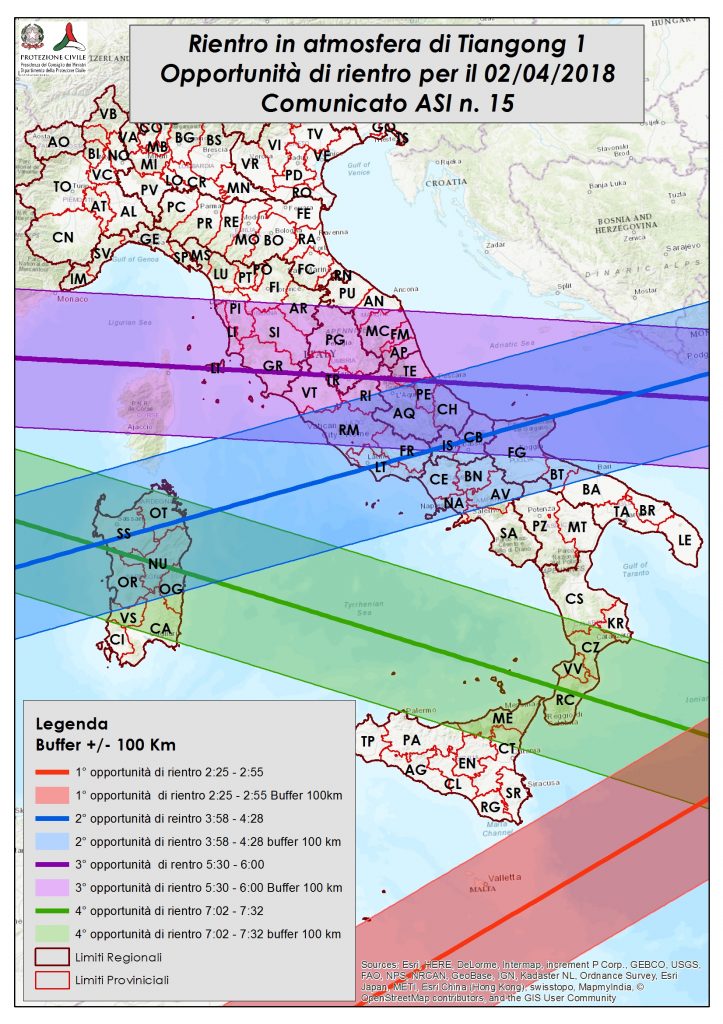 Una mappa pubblicata dall’Agenzia Spaziale Italiana (ASI) mostra le traiettorie, le fasce orarie e le aree geografiche in Italia che potrebbero essere interessate dal rientro sulla Terra della Stazione spaziale cinese.