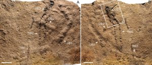 Queste orme forniscono la prova di una minuscola creatura che camminava su due zampette ed era capace di scavare nel sedimento sul bordo dell’acqua e della terra.