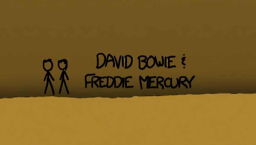 L’illustrazione presenta anche le figure stilizzate di David Bowie e Freddie Mercury che si trovano ad una profondità tra i 5mila e i 6mila metri, in riferimento alla loro canzone “Under Pressure”.