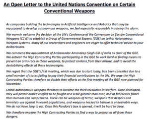 “Le armi autonome letali minacciano di diventare la terza rivoluzione in ambito bellico: una volta sviluppati, permetteranno di far sì che i conflitti armati siano combattuti su una scala più grande che mai, e con tempi più rapidi di quanto gli umani possano comprendere”, si legge nella lettera. “Possono essere armi del terrore, armi che despoti e terroristi utilizzano contro popolazioni innocenti, e che potranno essere hackerate per comportarsi in modo