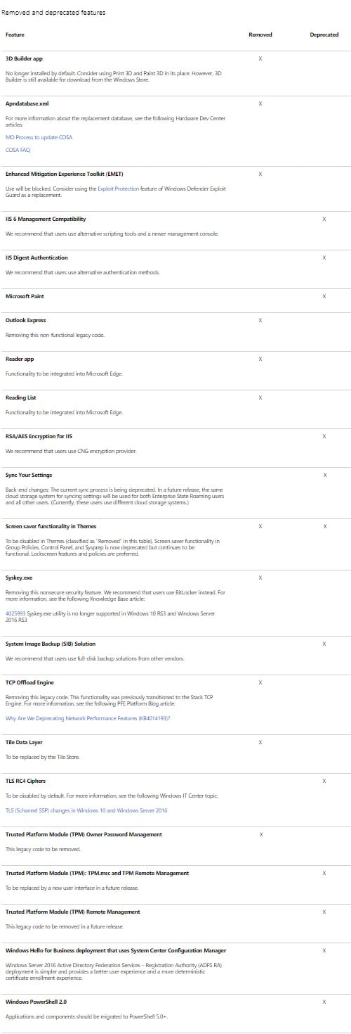 Windows 10 Fall Creators Update arriverà ufficialmente a partire da questo autunno. Qui di seguito una tabella delle applicazioni che Microsoft ha deciso di rimuovere e/o di non supportare più. C’è una differenza tra le app rimosse, quelle delle quali non vi sarà più alcuna traccia e quelle deprecate, che saranno ancora presenti e utilizzabili ma saranno più aggiornate.