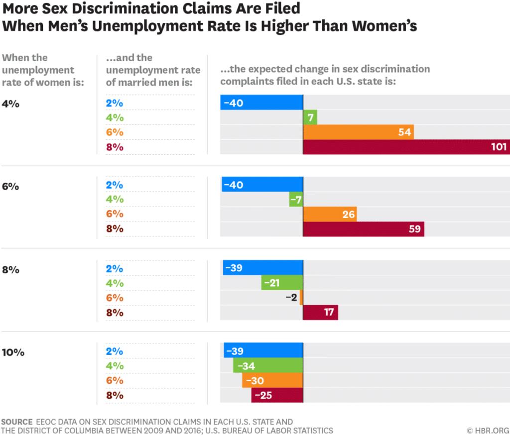 Secondo i dati analizzati da Dan Cassino, professore associato di scienze politiche presso la Fairleigh Dickinson University di Teaneck in New Jersey, quando il tasso di disoccupazione degli uomini sposati è doppio rispetto a quello delle donne, raddoppiano anche le denunce per molestie.