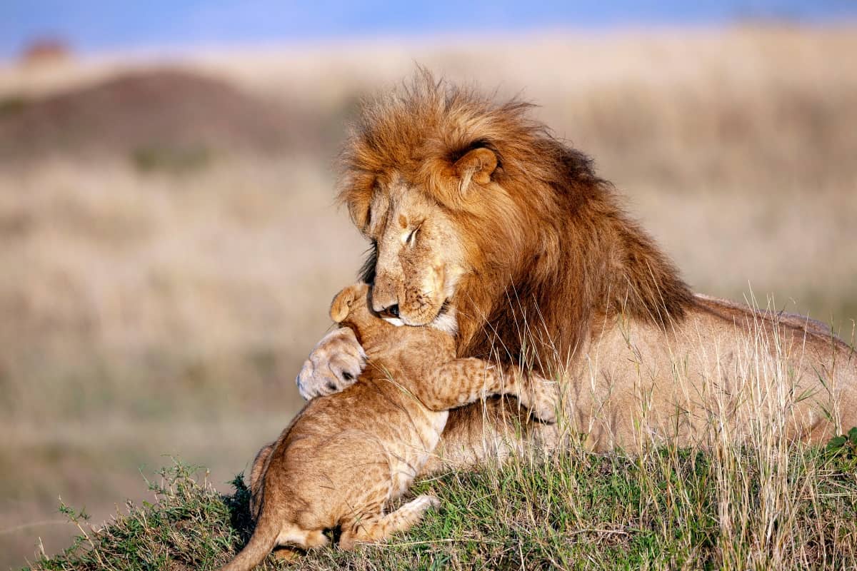 Nell’immagine si vedono un leone e il suo cucciolo mentre si stringono in un tenero abbraccio.