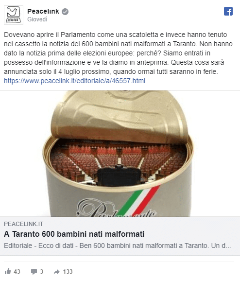 A lanciare per primo la notizia era stato il sito di cittadinanza attiva Peacelink.it: “Il M5S doveva aprire il Parlamento come una scatoletta di tonno. Adesso che sono al governo hanno tenuto nel cassetto il nuovo studio epidemiologico Sentieri. Uno studio già pronto di cui era stata annunciata la presentazione ufficiale per maggio”, hanno scritto su Facebook.