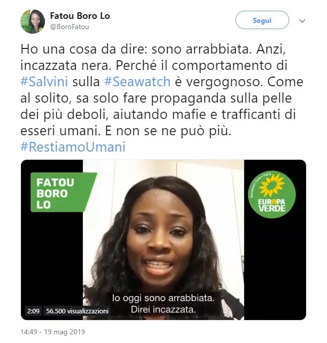 Ricevere una valanga di insulti razzisti dopo un video pubblicato online in cui critica Matteo Salvini. È quanto accaduto ad una candidata alle Elezioni Europee di domenica 26 maggio, Fatou Boro Lo, rappresentante di Possibile in corsa per la lista Europa Verde. Su Twitter ha caricato un filmato di poco più di 2 minuti in cui definisce il comportamento del ministro dell’Interno sulla vicenda Sea Watch “vergognoso”. “Come al solito, sa solo fare propaganda sulla pelle dei più deboli, aiutando mafie e trafficanti di esseri umani. E non se ne può più”, ha scritto la candidata nel suo messaggio.