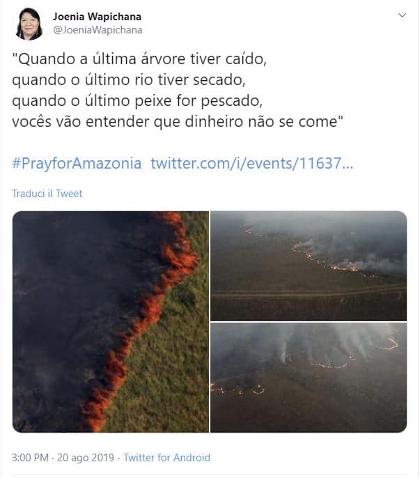 “Quando l’ultimo albero è caduto, quando l’ultimo fiume si è seccato, quando viene pescato l’ultimo pesce, capirai che il denaro non viene mangiato“, scrive Joenia in un tweet, in cui condivide le devastanti immagini della foresta Amazzonica che in queste ore sta bruciando in Brasile anche a causa delle politiche a favore della deforestazione di Jair Bolsonaro.