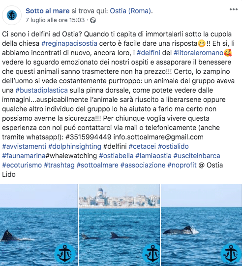 “Ci sono i delfini a Ostia? Quando ti capita di immortalarli sotto la cupola della chiesa Regina Pacis certo è facile dare una risposta! Eh si, li abbiamo incontrati di nuovo, ancora loro, i delfini del litorale romano vedere lo sguardo emozionato dei nostri ospiti e assaporare il benessere che questi animali sanno trasmettere non ha prezzo!”, si legge su Facebook.