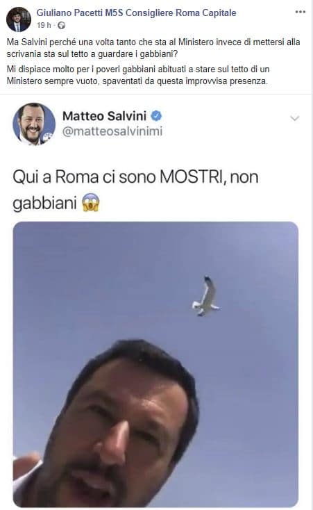 “Ma Salvini perché una volta tanto che sta al Ministero invece di mettersi alla scrivania sta sul tetto a guardare i gabbiani?” scrive Pacetti sul suo post.