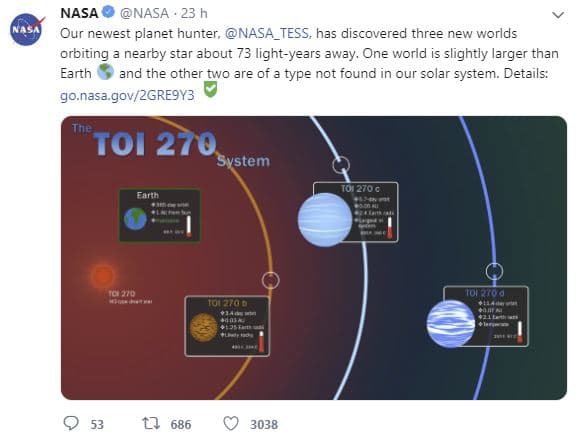 L’intero sistema si chiama Toi-270 e al suo interno ruotano tre mondi “alieni” (Toi-270b, Toi-270c e Toi-270d), che impiegano rispettivamente 3, 5 e 11 giorni circa a ruotare intorno al loro sole, grande un terzo del nostro.