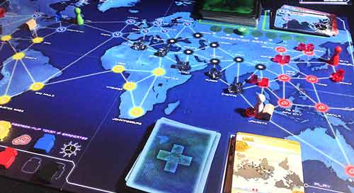 Va detto che questo è davvero un gioco davvero ben fatto (con tanto di pagina wikipedia), con molte espansioni al suo attivo, una versione “decimo anniversario” appena uscita e delle varianti che utilizzano il “motore del gioco” su altre ambientazioni (invasioni dei barbari nell’impero romano, l’arrivo dei Grandi Antichi sulla terra, tanto per dirne un paio) ma tutte con meccanismi tutto sommato riconducibili a quello del gioco originale, in cui i giocatori sono un team di medici, ricercatori e specialisti vari che hanno il compito di debellare le quattro malattie che stanno affliggendo l’umanità, muovendosi sul tabellone, scambiandosi carte, cercando di contenere le infezioni che si propagano di città in città.