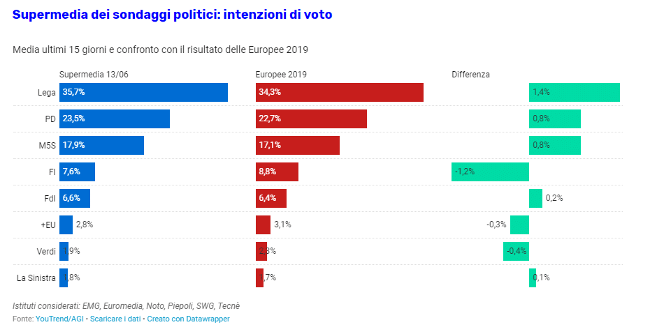 Youtrend ha segnalato: la Lega al 35,7 per cento di consensi, in crescita di 1,4 punti rispetto alle Elezioni Europee; il Partito Democratico al 23,5 per cento, in salita di 0,8 punti; il Movimento 5 Stelle al 17,9 per cento in ascesa come il Pd di 0,8 punti di consenso; Forza Italia al 7,6 per cento, in calo di 1,2 punti dopo il già deludente 8,8 per cento del 26 maggio; Fratelli d’Italia al 6,6 per cento, in crescita di 0,2 punti; +Europa al 2,8 per cento, con una flessione di 0,3 punti dal risultato delle urne; i Verdi all’1,9 per cento, in discesa di 0,4 punti; e infine La Sinistra all’1,8 per cento, in linea con l’1,7 per cento del 26 maggio.