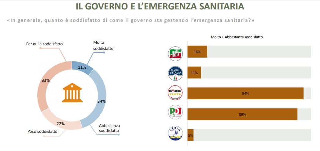 Alla domanda su quanto è soddisfatto della gestione dell’emergenza sanitaria da parte del governo, il 33 per cento del campione ha risposto “per nulla”, mentre il 22 per cento “poco”. Solo l’11 per cento è “molto soddisfatto”, mentre il restante 34 per cento “abbastanza”. Anche sulla gestione dell’emergenza economica, non arrivano grandi riscontri per il premier Conte: il 49 per cento, la metà del campione, è “per nulla soddisfatto”, il 21 “poco”, il 25 “abbastanza” e solo il 5 “molto soddisfatto”.