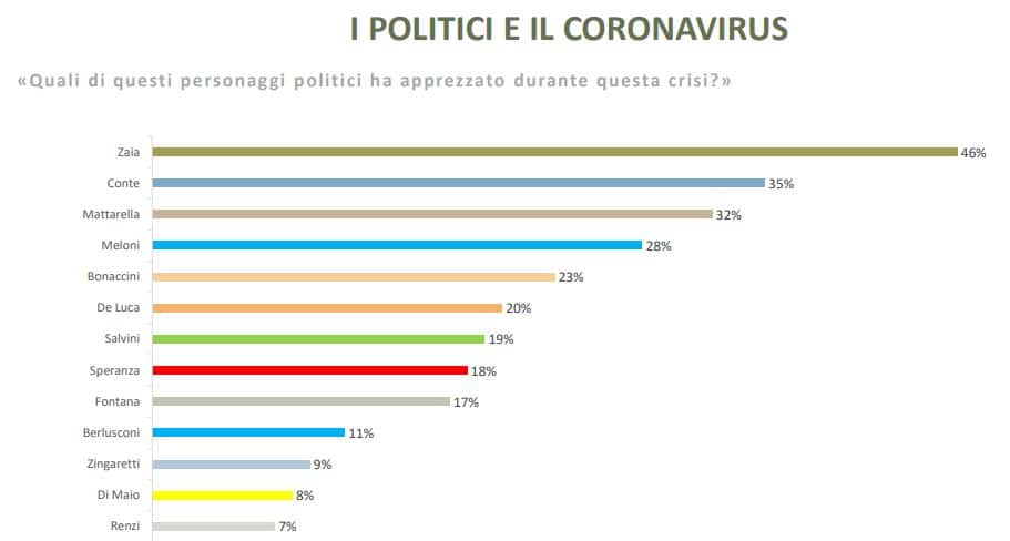Emblematici i dati del sondaggio di Winpoll anche in relazione al gradimento dei singoli leader nazionali. Alla domanda su quale dei leader nazionali e regionali sono stati più apprezzati durante la crisi da Coronavirus, il governatore veneto Luca Zaia è stato nominato dal 46 per cento degli intervistati. Conte “solo” dal 35 per cento. Più indietro il presidente della Repubblica, Sergio Mattarella (32 per cento), la leader di Fratelli d’Italia Giorgia Meloni (28) e il presidente della Regione Emilia-Romagna, Stefano Bonaccini (23 per cento).
