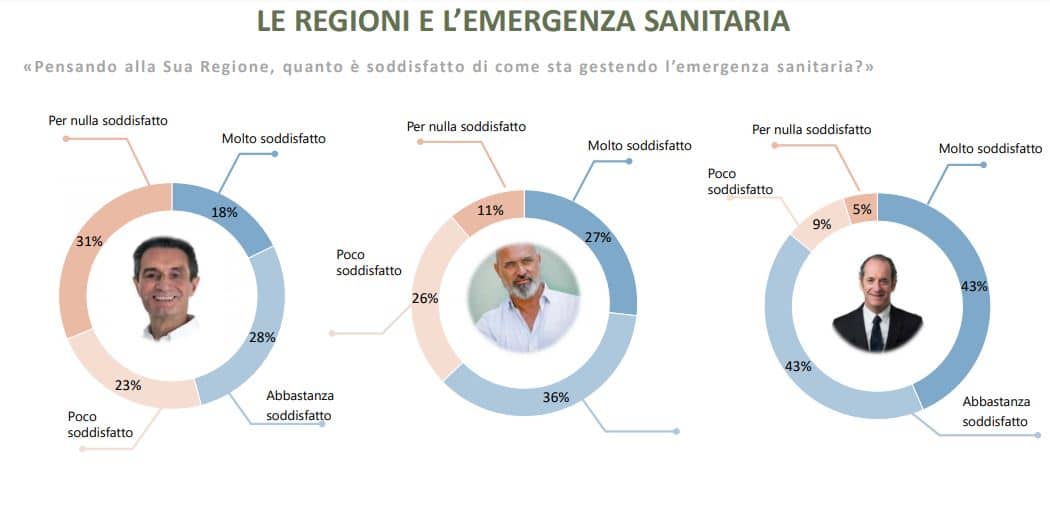 Sui dati regionali, poi, da segnalare che il 55 per cento dei cittadini lombardi non sono soddisfatti dell’operato del governatore Attilio Fontana, mentre i veneti non soddisfatti di Zaia sono “solo” il 14 per cento.