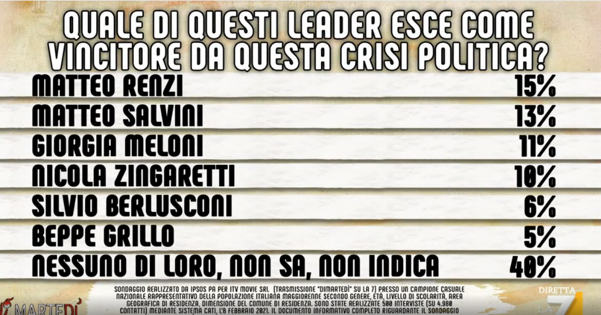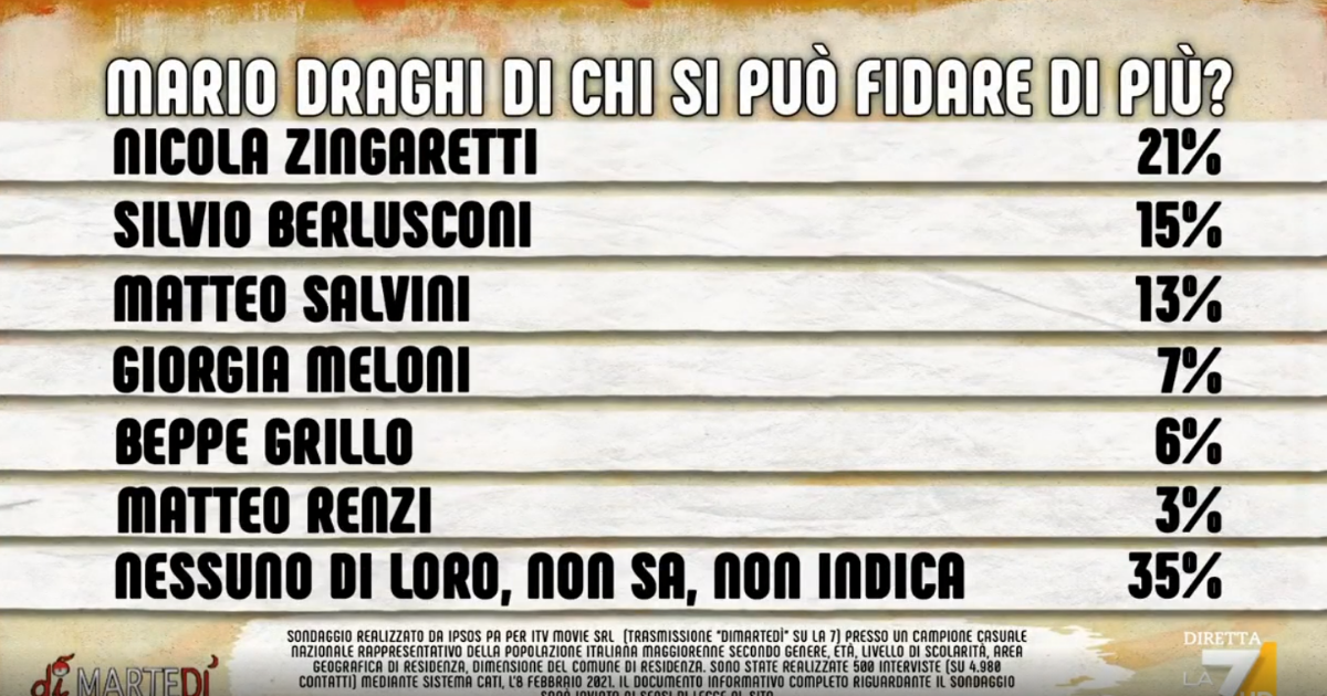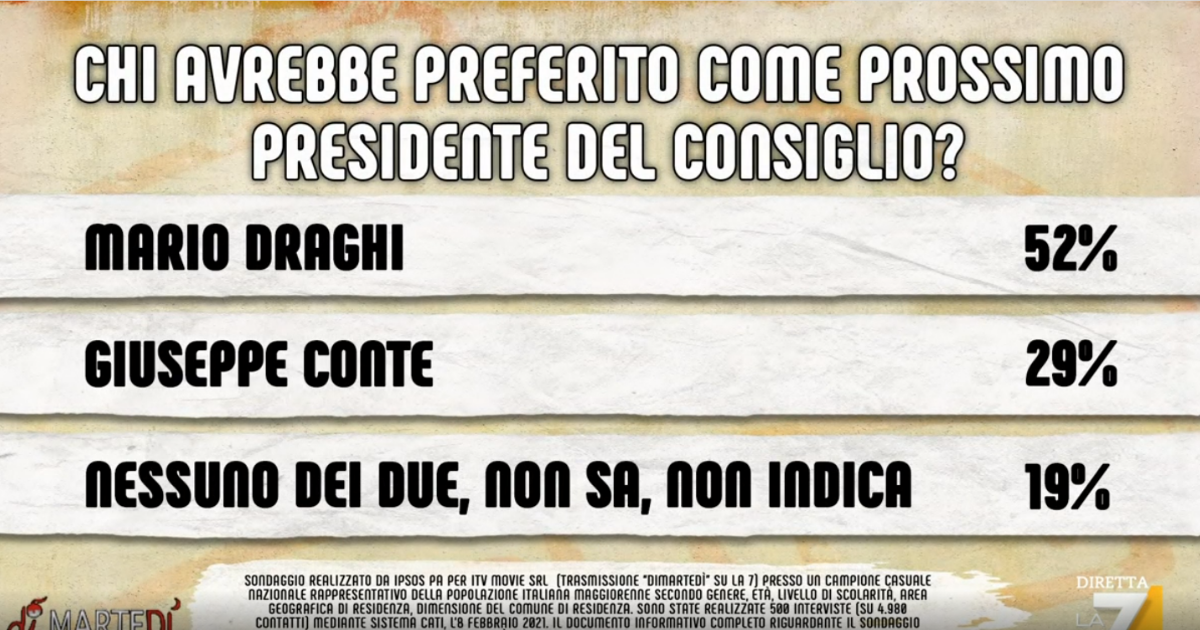Tra le due figure, il 52 per cento degli italiani ha risposto Mario Draghi, mentre solo il 29 per cento sceglie Giuseppe Conte. Il restante 19 per cento risponde nessuno dei due, non sa, o non indica nessuna delle due figure. In una settimana si è avuta una crescita nel consenso per Mario Draghi, perché 7 giorni fa era al 41 per cento.