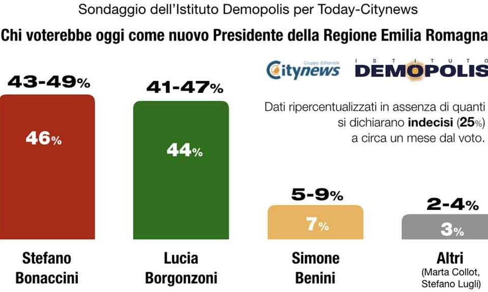 Secondo Demopolis, il governatore uscente e candidato di centrosinistra Stefano Bonaccini è poco avanti sulla candidata di centrodestra Lucia Bergonzoni. Bonaccini è in una forbice tra il 43 al 49 per cento. Borgonzoni nei sondaggi è tra il 41 e il 47 per cento. Simone Benini, candidato del Movimento 5 Stelle, viene dato da Demopolis dà al 7 per cento.