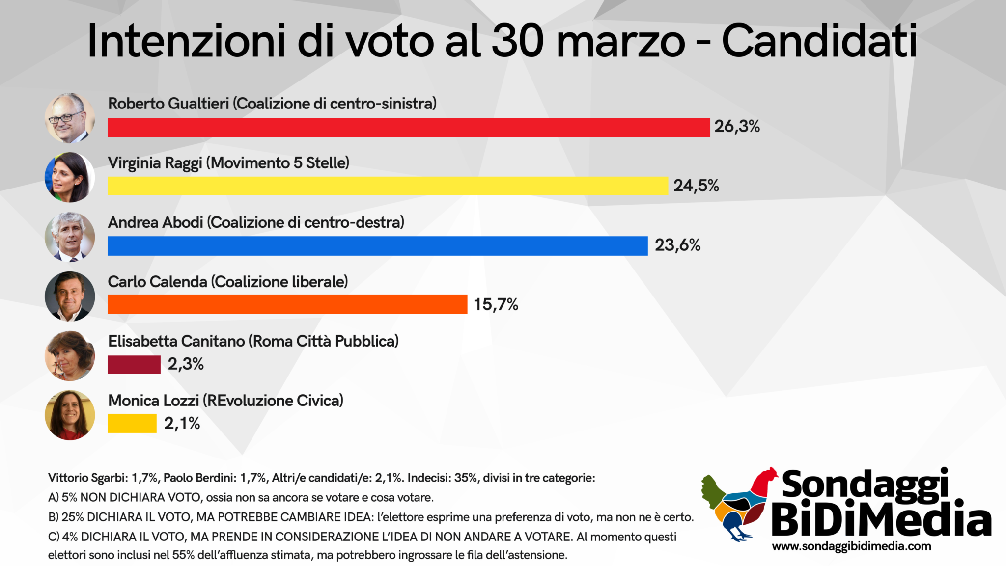 SONDAGGI POLITICI ELETTORALI OGGI – Secondo gli ultimi sondaggi di BiDiMedia pubblicati da RomaToday sulle elezioni a Roma e realizzati sulla base del parere di 1.700 cittadini romani: “La corsa per il Campidoglio vede tutt’ora un quadro politico non definito sia per quanto riguarda i candidati sia riguardo alle possibili coalizioni. Abbiamo quindi selezionato, per poter realizzare il sondaggio, uno scenario di base ritenuto ad oggi solo il più probabile tra i tanti possibili, consapevoli che potrà mutare anche in maniera significativa”.