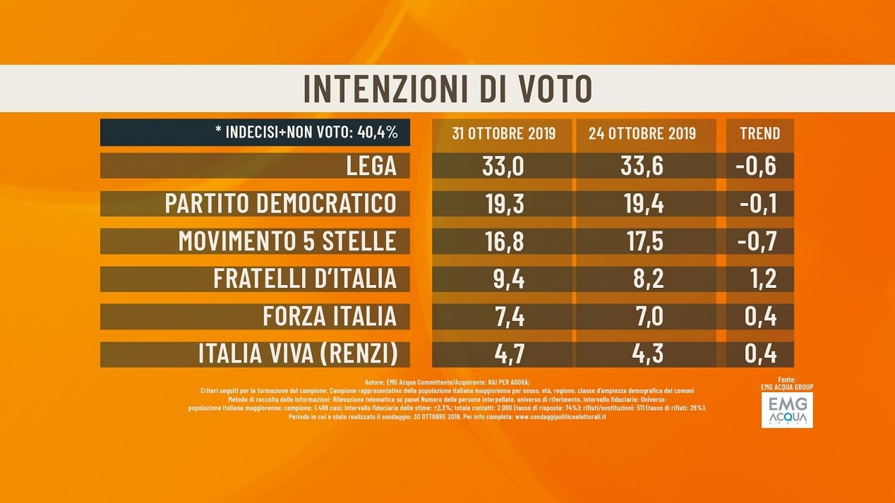 Qui riportiamo alcuni dati degli istituti demoscopici aggiornati ad oggi, venerdì 1 novembre 2019.