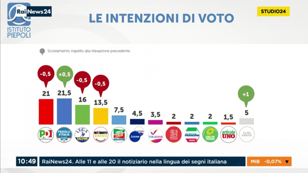 Secondo la rilevazione, infatti, Fratelli d’Italia guadagna mezzo punto percentuale rispetto al sondaggio precedente e vola al primo posto con il 21,5%. Il partito guidato da Giorgia Meloni scavalca il Partito Democratico, che nel frattempo cala dello 0,5 per cento arretrando, così, al 21%.