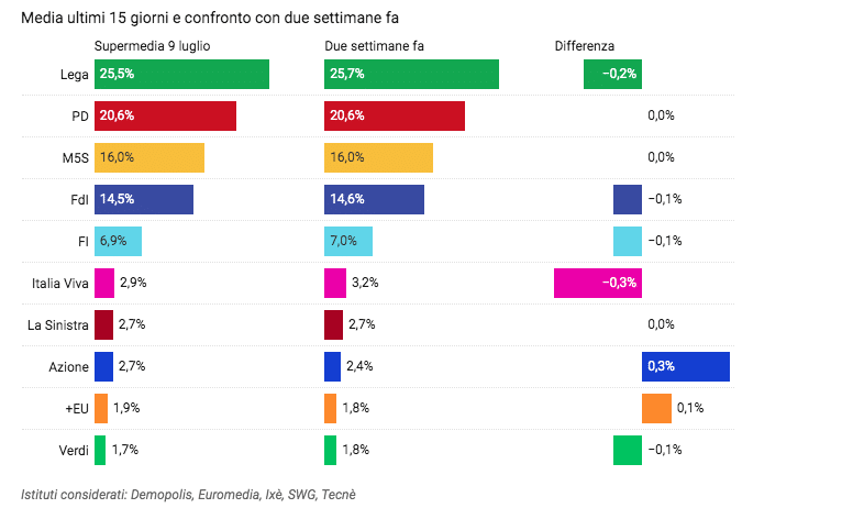 Nelle intenzioni di voto rilevate dalla Supermedia YouTrend / AGI del 9 luglio, la Lega occupa sempre il primo posto con il 25,5 per cento dei consensi, pur registrando un calo dello 0,2 per cento rispetto a due settimane fa. Stabile il Partito Democratico al 20,6 per cento, così come resta inchiodato il Movimento 5 Stelle al 16,0 per cento. Lieve flessione di Fratelli d’Italia che scende dal 14,6 al 14,5 per cento. In ribasso anche le quotazioni di Forza Italia che perde un decimo e si attesta al 6,9 per cento.