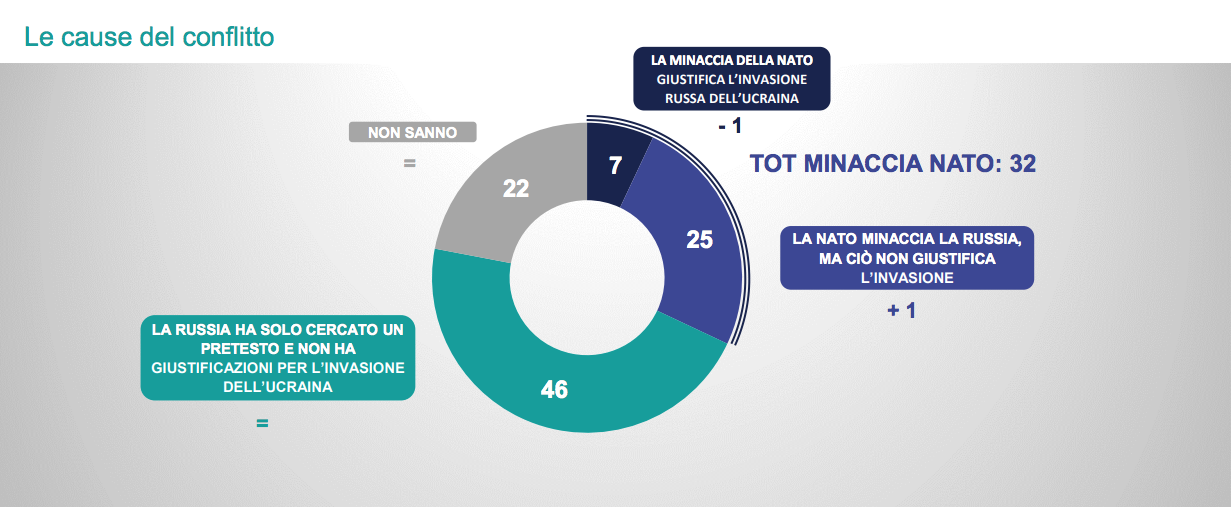 Il 25 per cento non giustifica la Russia per aver intrapreso la guerra in Ucraina, ma ritiene comunque che la Nato sia “una minaccia” per Mosca. A questa percentuale va ad aggiungersi un 7 per cento di intervistati, i quali pensano che la minaccia della Nato nei confronti della Russia giustifichi l’invasione dell’Ucraina. Il 22% degli italiani, infine, non esprime un’opinione in merito.