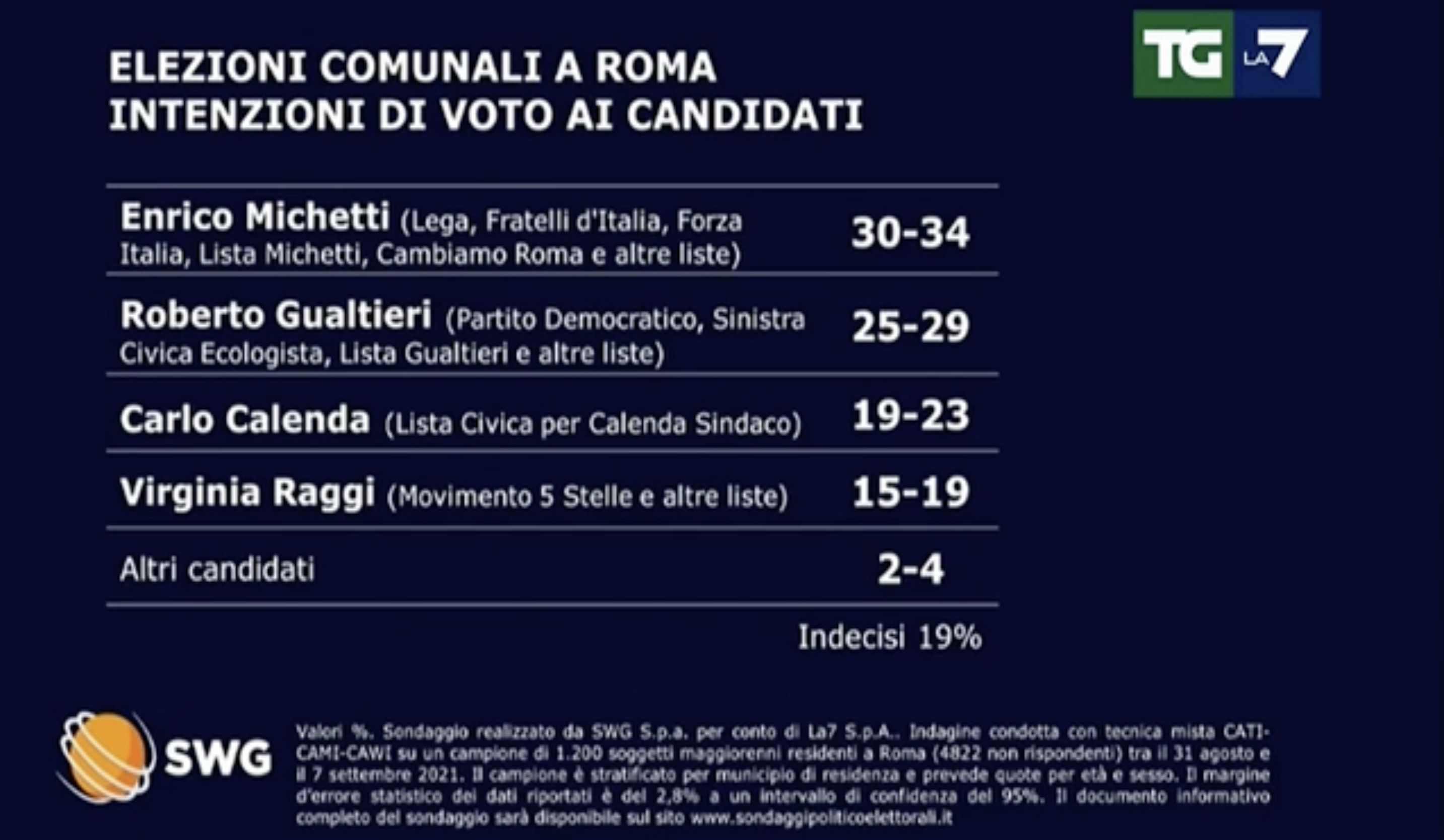 Secondo la rilevazione, infatti, Michetti è in testa con una forbice che va dal 30 al 34 per cento. Al secondo posto c’è il candidato del Pd, Roberto Gualtieri, accreditato tra il 25 e il 29%, mentre subito dopo c’è Carlo Calenda, la cui stima si aggira tra il 19 e il 23 per cento. Alla sindaca uscente Virginia Raggi viene attribuito tra il 15 e il 19%, mentre la quota degli indecisi si assesta al 19 per cento.