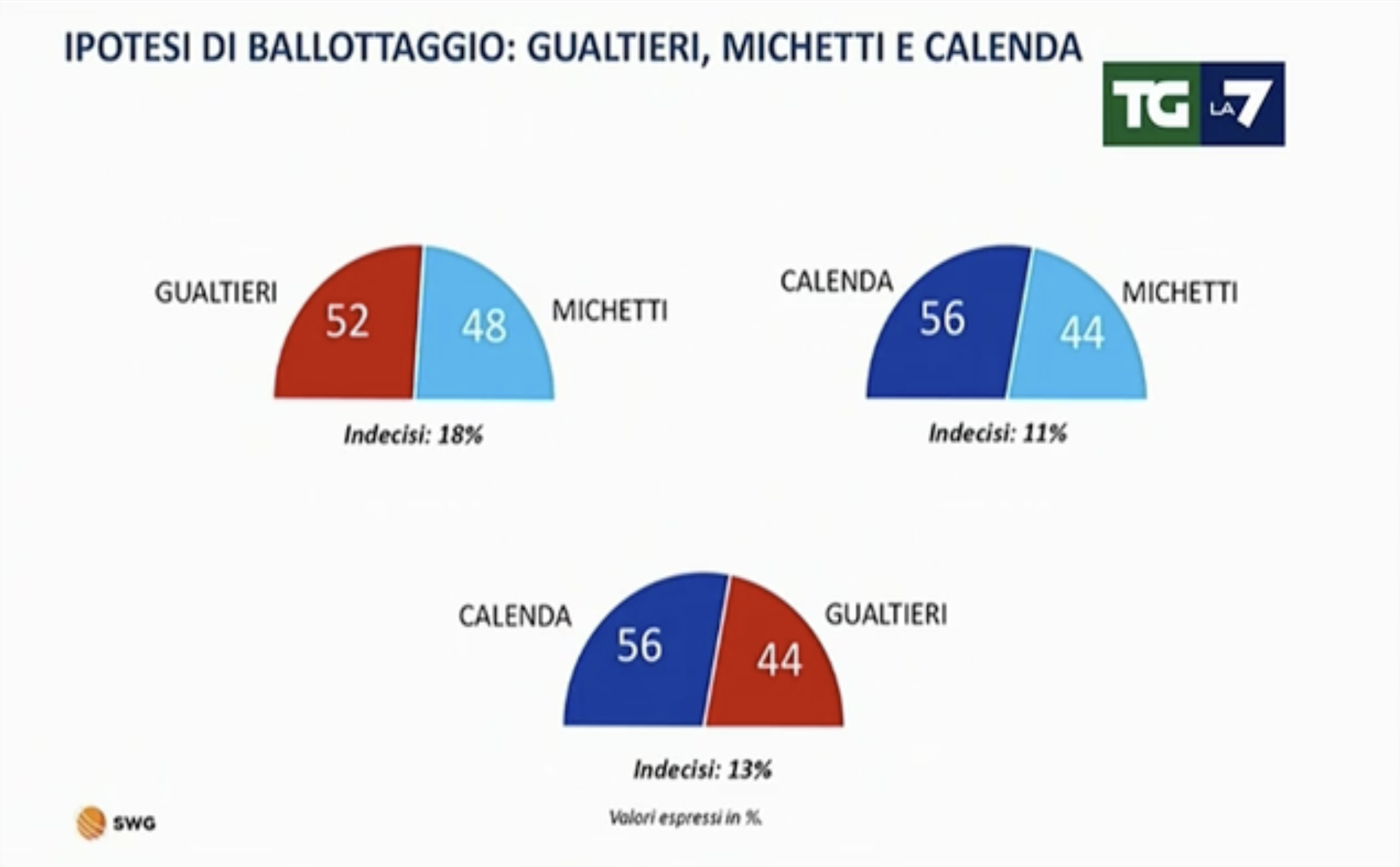 Lo scenario, però, potrebbe completamente cambiare al ballottaggio. Secondo il sondaggio, infatti, in caso di ballottaggio tra Gualtieri e Michetti sarebbe il primo a prevalere con il 52 per cento dei voti. Addirittura superiore la percentuale con la quale Carlo Calenda, qualora arrivasse al ballottaggio con Michetti, batterebbe il candidato del centrodestra: 56%. La stessa percentuale viene attribuita a Calenda anche in caso di ballottaggio con il candidato del centrosinistra, Gualtieri.