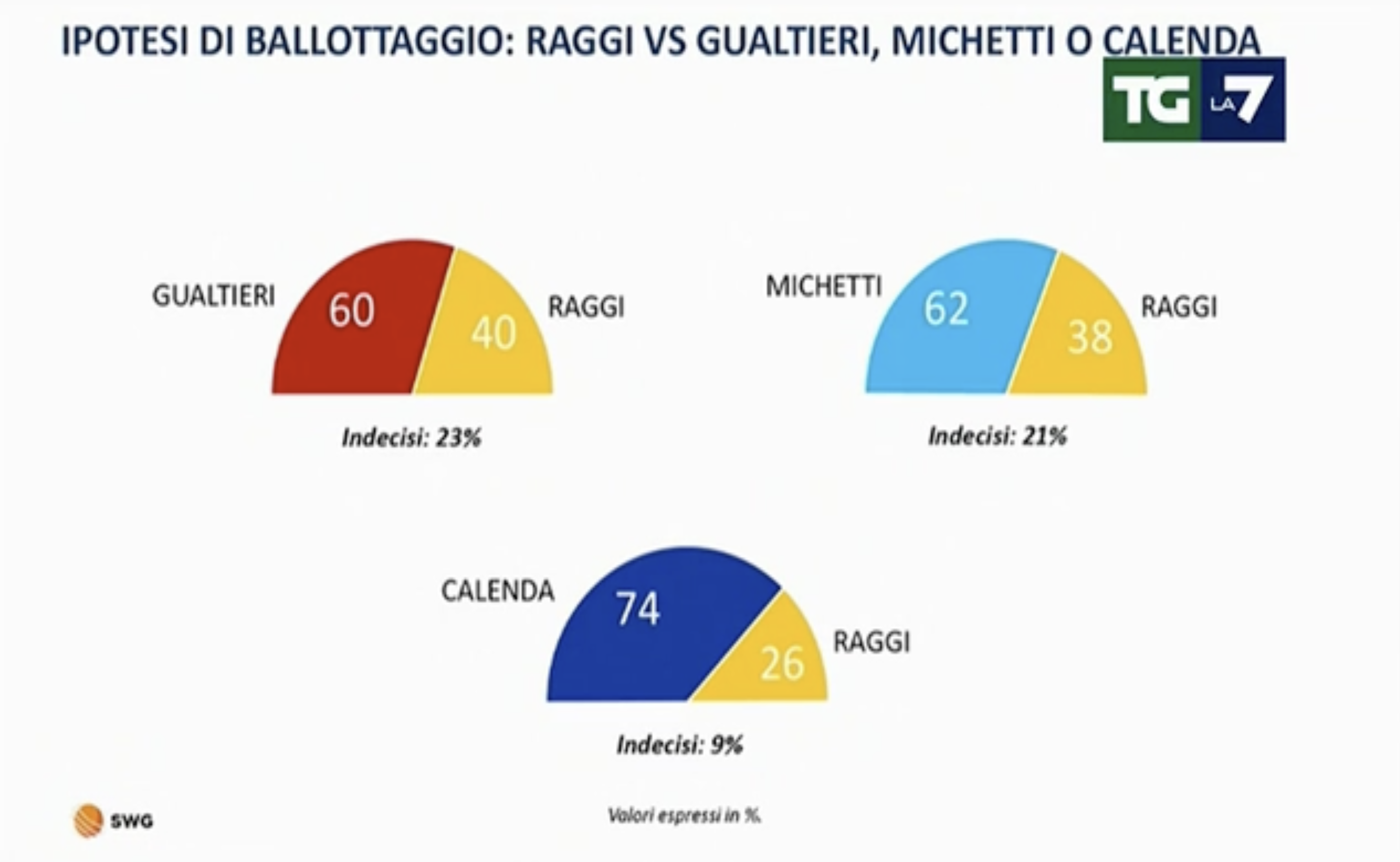 Nel caso in cui al ballottaggio andassero Gualtieri e Raggi, invece, sarebbe il candidato del Pd a prevalere con il 60% delle preferenze. In una ipotetica sfida Michetti-Raggi, invece, sarebbe il candidato del centrodestra a vincere la competizione elettorale con il 62 per cento dei voti. La sindaca uscente perderebbe anche con Carlo Calenda, che, secondo la rilevazione, prevarrebbe sulla rivale con il 72%.