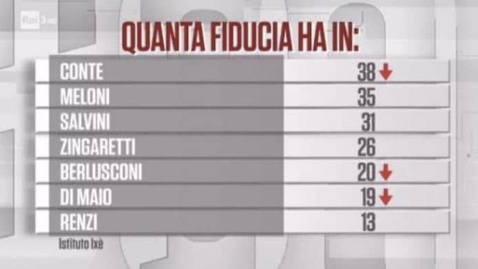 Interessanti, infine, i dati relativi al gradimento dei leader. Il premier Giuseppe Conte guida la classifica con il 38 per cento, in calo però rispetto a settimana scorsa. Anche qui c’è però una batosta per Salvini: Giorgia Meloni lo ha superato, piazzandosi al secondo posto. Il gradimento per la leader di Fdi è al 35 per cento, mentre per il segretario del Carroccio è al 31. Indietro, Nicola Zingaretti (Pd) al 26 per cento, Silvio Berlusconi (Forza Italia) al 20 per cento, Luigi Di Maio (M5S) al 19 per cento e Matteo Renzi (Italia Viva) al 13.