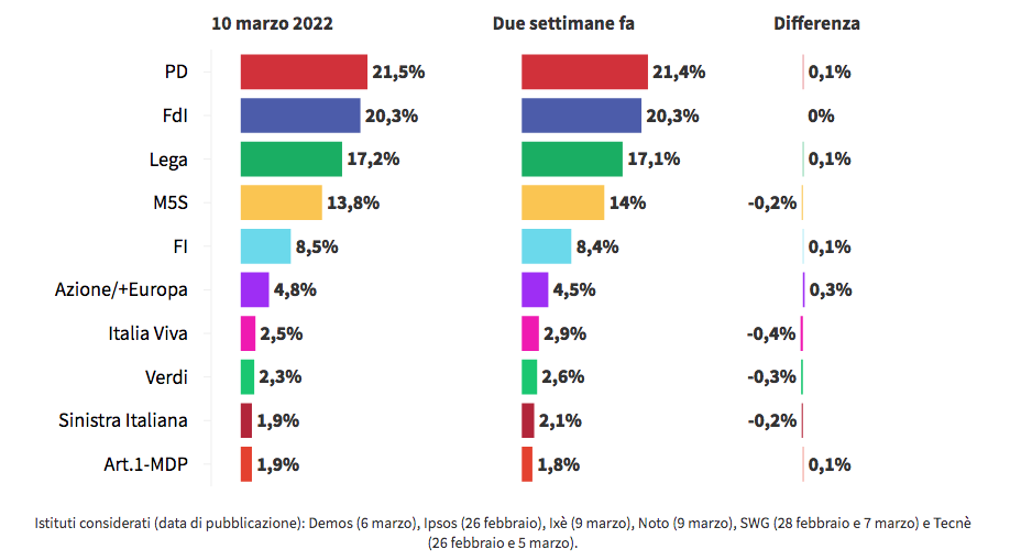 SONDAGGI POLITICI ELETTORALI OGGI – Secondo la Supermedia degli ultimi sondaggi politici realizzata da YouTrend/Agi, nelle ultime due settimane – da quando cioè è iniziato il conflitto in Ucraina – le intenzioni di voti degli italiani sono rimaste uguali. Come se l’invasione russa e la situazione attuale abbia “congelato” il quadro politico per quanto riguarda gli orientamenti di voto. Il Partito Democratico, riporta Youtrend, è infatti in testa col 21,5%, seguito da Fratelli d’Italia al 20,3%, e dalla Lega al 17,2%. Il Movimento 5 Stelle registra ancora il dato più basso dall’inizio dell’attuale legislatura: e cioè il 13,8%. Chiudono il quadro dei partiti principali Forza Italia con l’8,5% e la federazione tra Azione e +Europa al 4,8%.