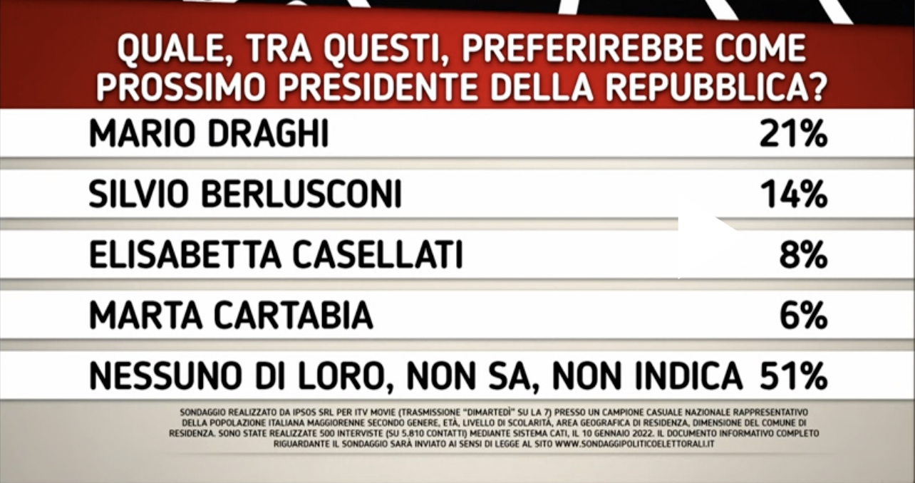 Ma andiamo con ordine. Alla domanda “Quale, tra questi, preferirebbe come prossimo presidente della Repubblica?” il 21% degli intervistati ha indicato il nome dell’attuale premier Mario Draghi.