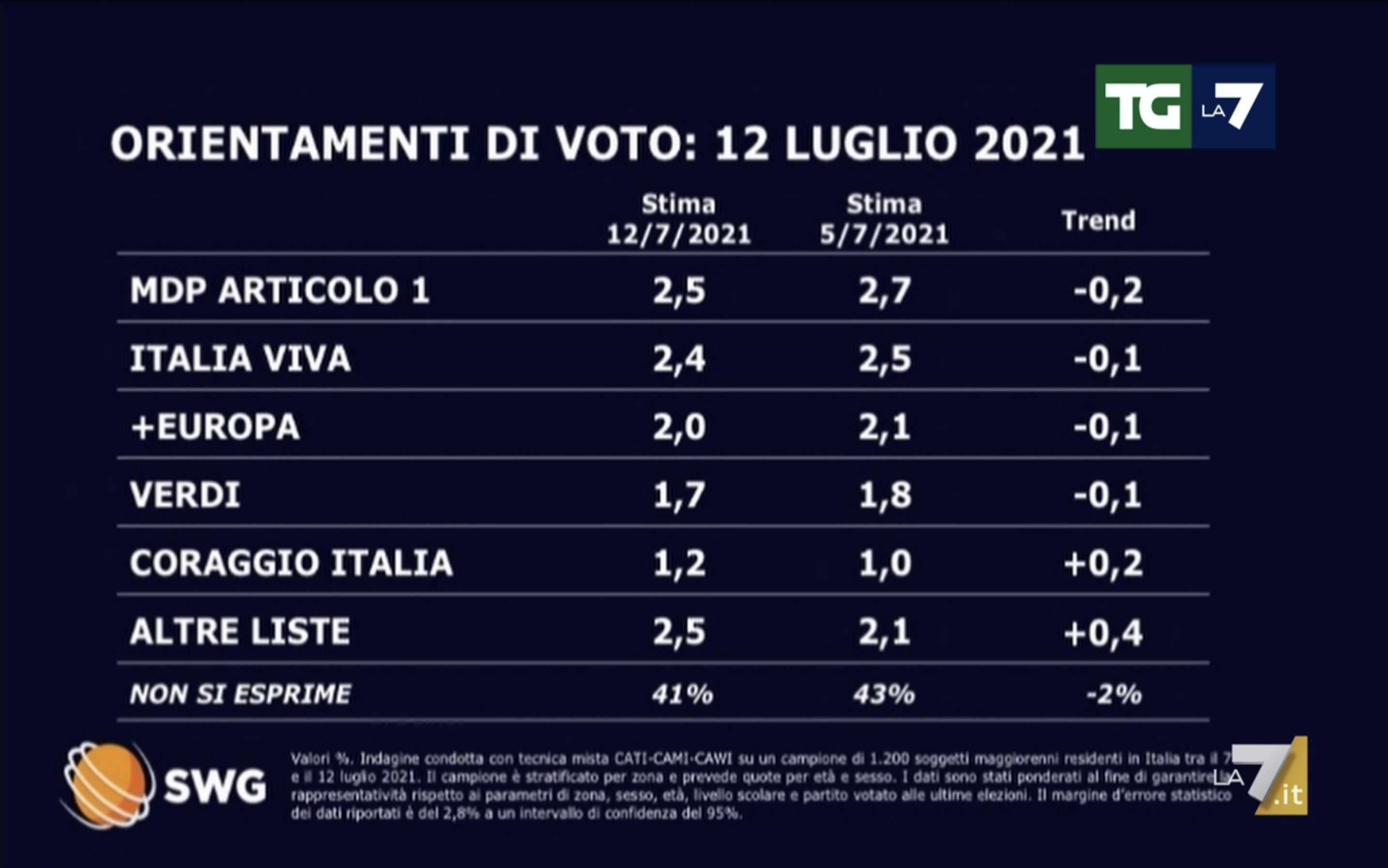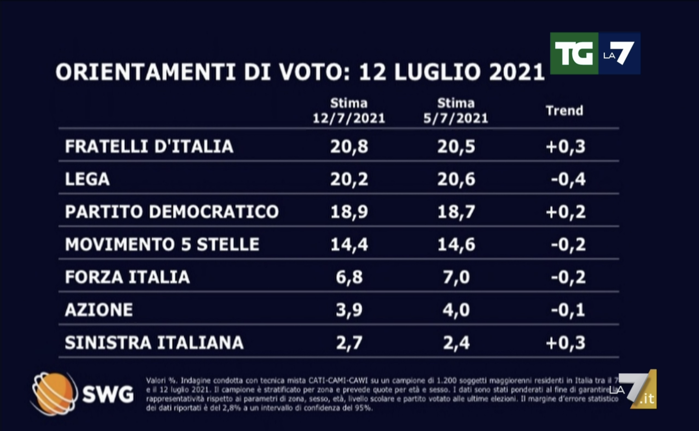 SONDAGGI POLITICI ELETTORALI OGGI 13 LUGLIO 2021