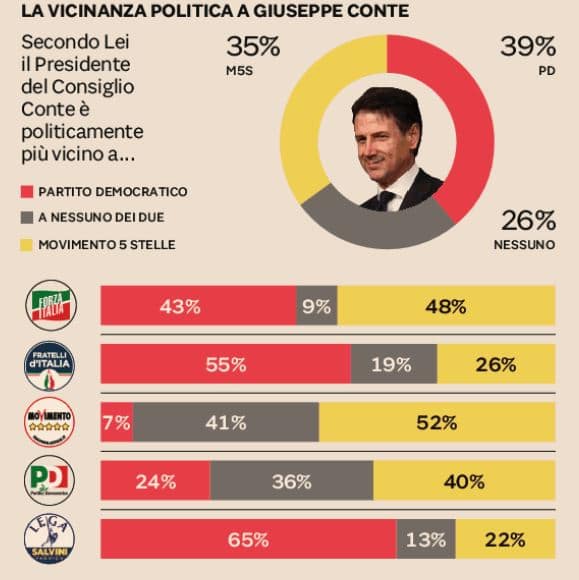 Così, nell’ultimo sondaggio di Winpoll per IlSole24Ore è stato chiesto al campione degli intervistati a quale partito pensano Conte sia più vicino. Il risultato è stato in parte una sorpresa. “Solo” il 35 per cento, infatti, crede che il M5S sia la naturale casa politica di Conte, da sempre considerato vicinissimo ai pentastellati, mentre il 39 per cento propende maggiormente per il Pd. Per il resto del campione, invece, Conte non è assimilabile a nessuno dei due partiti di maggioranza.