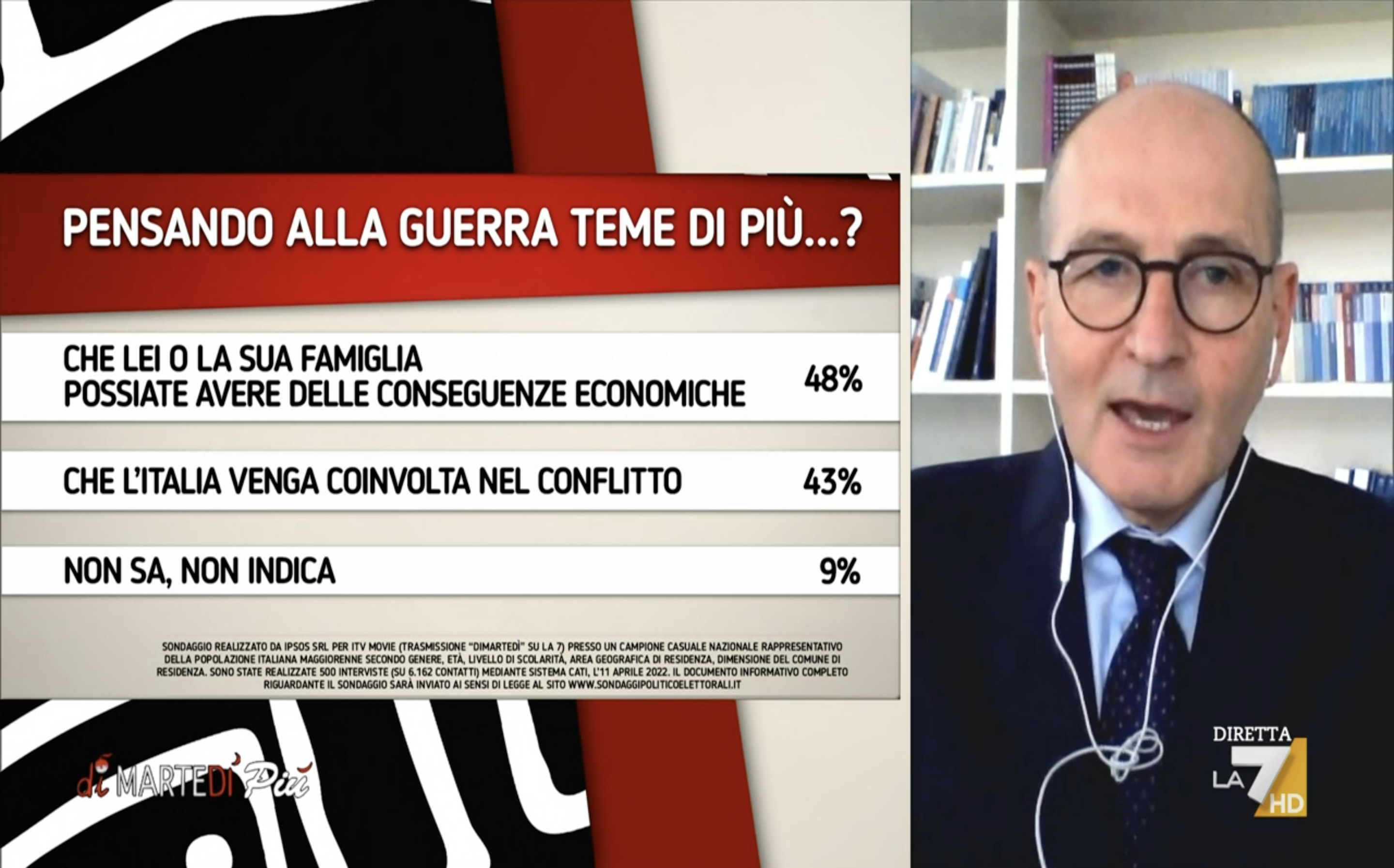 SONDAGGI POLITICI ELETTORALI OGGI – Gli italiani sono più preoccupati dalle conseguenze economiche causate dalla guerra in Ucraina che da un possibile coinvolgimento del nostro Paese nel conflitto: è quanto emerge dagli ultimi sondaggi politici elettorali elaborati da Ipsos per il programma di La7 DiMartedì.