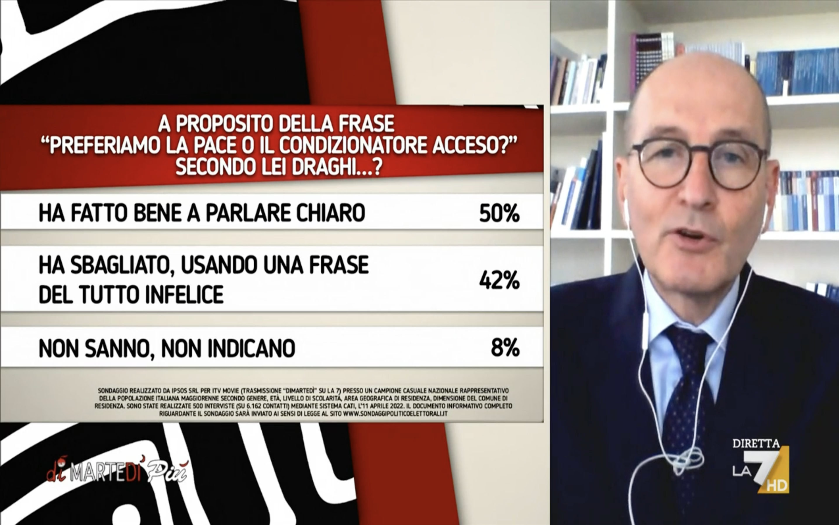 Sulle discusse dichiarazioni del premier Draghi, che nel corso di una conferenza stampa ha affermato: “Preferiamo la pace o il condizionatore acceso?”, il 50 per cento degli intervistati ritiene che il presidente del Consiglio abbia fatto bene a “parlare chiaro”.