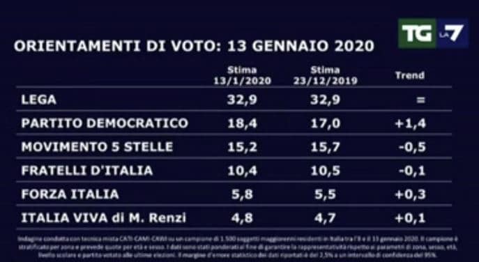 Sondaggi politici elettorali oggi 14 gennaio 2020: Lega stabile, balzo del Pd