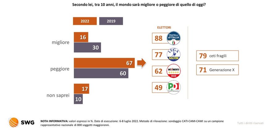 SONDAGGI POLITICI ELETTORALI OGGI – Per il 67 per cento degli italiani, i due terzi, il mondo tra dieci anni sarà peggiore. Pessimismo che cresce tra la generazione x – i nati tra il 1960 e il 1980 – e i ceti più fragili: la percentuale in questi casi sale al 71 per cento. Tra chi vota Fratelli d’Italia, è l’88 per cento a credere che le cose si metteranno peggio di così tra dieci anni. Mentre la percentuale più bassa si trova tra i democratici: 49 per cento. Swg ha elaborato questi sondaggi politici intervistando 800 persone.