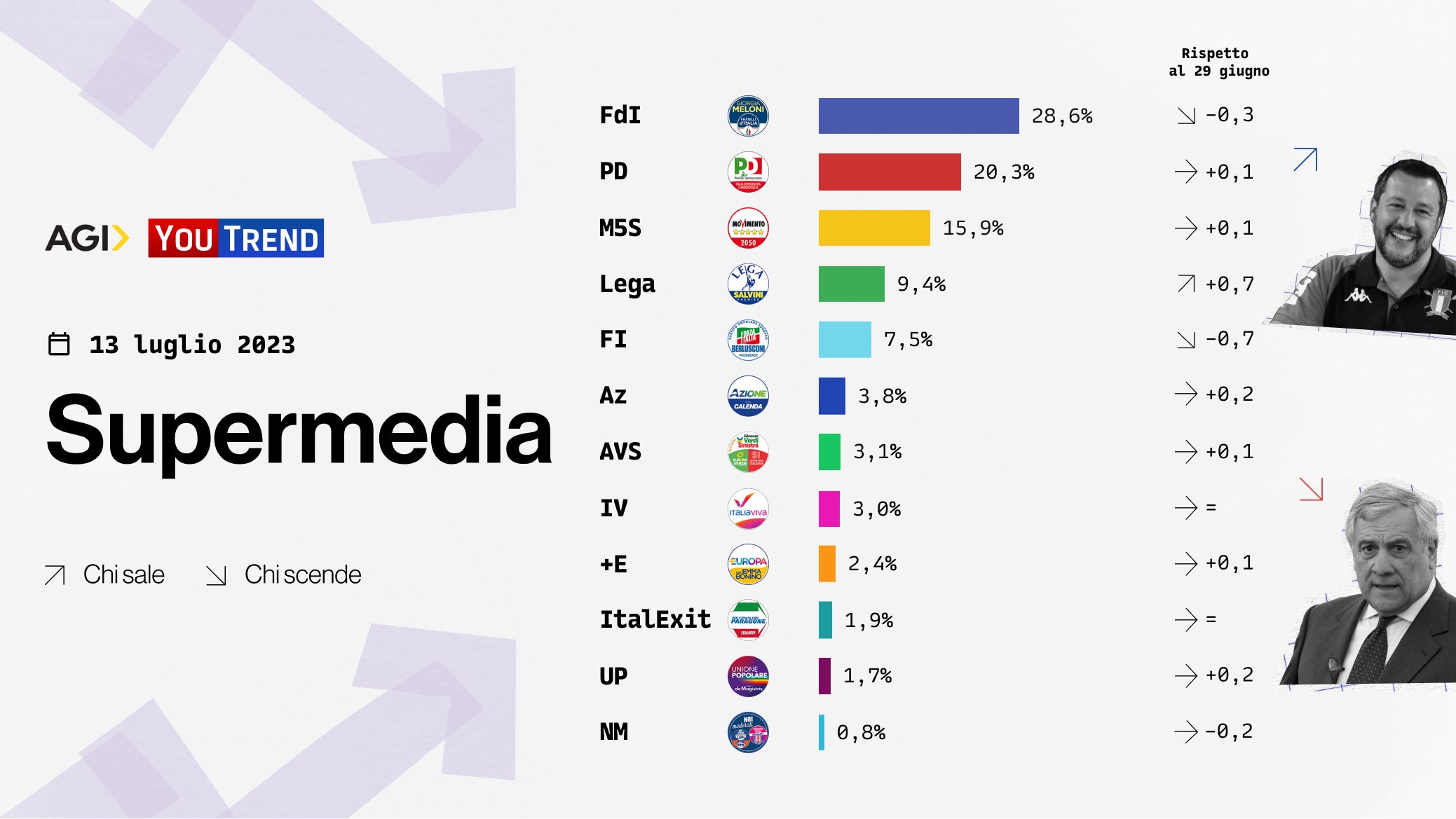 SONDAGGI POLITICI ELETTORALI – Continuano le scosse di assestamento all’interno del centrodestra. Dopo il boom di Forza Italia sull’onda della morte di Silvio Berlusconi, si sono ristabilite le gerarchie all’interno della coalizione al governo, con il ritorno della Lega al quarto posto tra i partiti, proprio ai danni degli azzurri. Lo conferma anche l’ultima Supermedia YouTrend/Agi, calcolata sulla base dei sondaggi dei principali istituti nazionali.