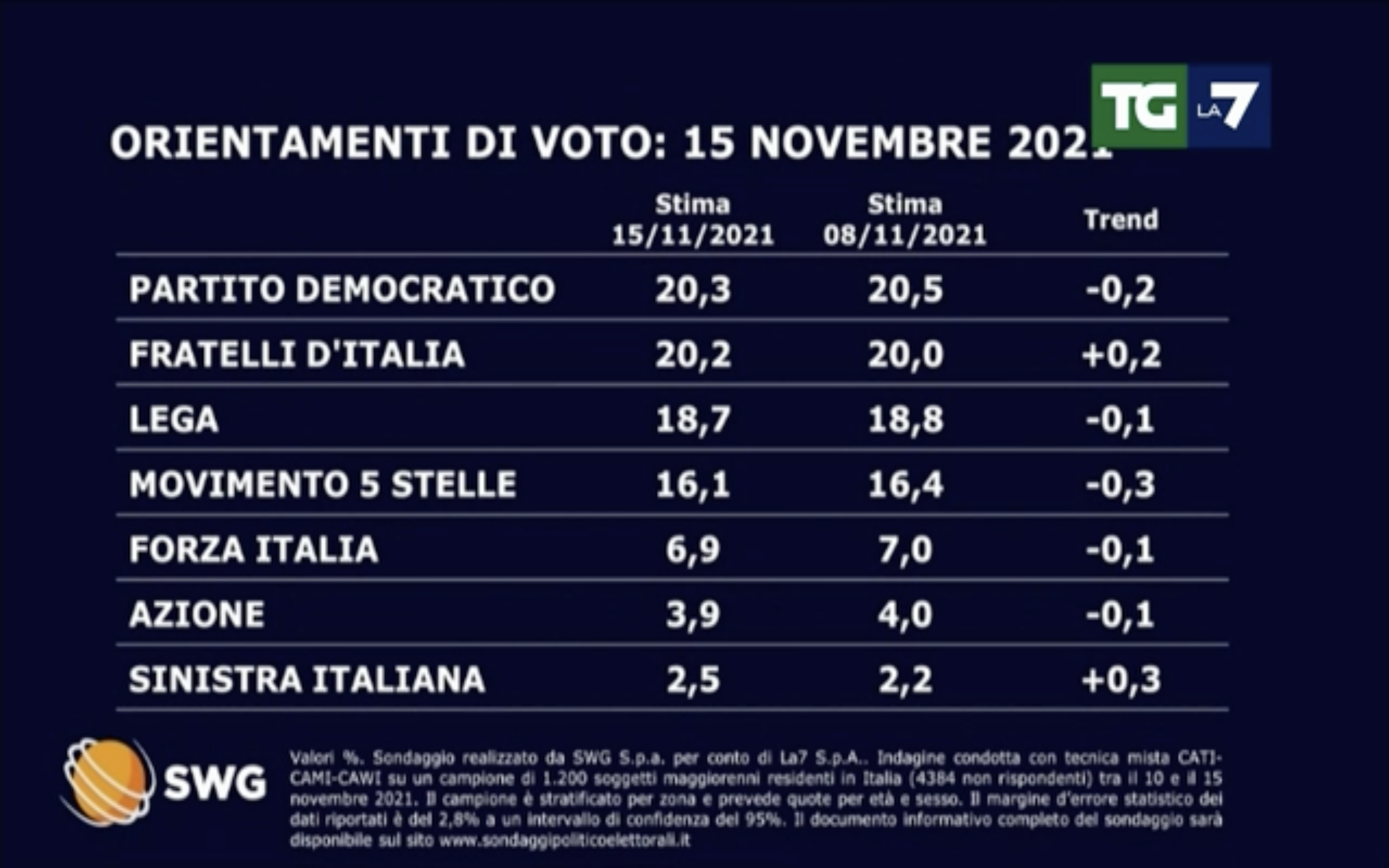 Forza Italia passa dal 7 al 6,9 per cento, mentre Azione torna sotto quota 4 per cento, 3,9% precisamente, calando dello 0,1 per cento.