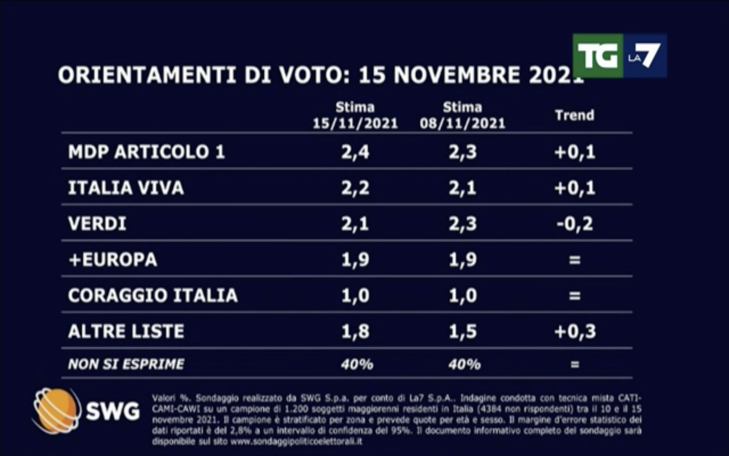 Sinistra Italiana guadagna lo 0,3 per cento, portandosi al 2,5%, mentre Articolo 1 sale al 2,4 per cento guadagnando uno 0,1% rispetto alla settimana precedente. Stessa percentuale guadagnata da Italia Viva che ora è accreditato al 2,2 per cento.